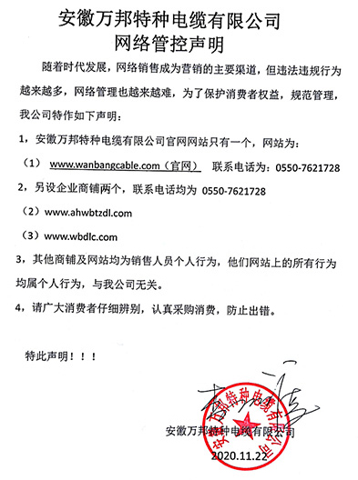 鄭重聲明:安徽萬邦特種電纜有限公司官方網站為:www_wanbangcable_com.gzcjdx.cn,除此之外無任何子網站或合作網站,其余均為假冒偽劣。電話:0550-7621728 13485756353 地 址:安徽省天長市滁州高新技術產業開發區經四路29號